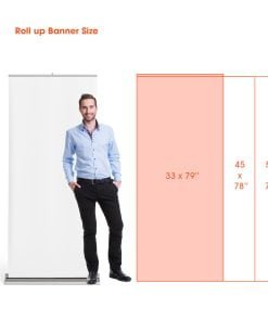 Our standard size is 33″ x 79″. This is the industry standard for trade shows because it provides a large visual impact while being narrow enough to fit into tight booth spaces.